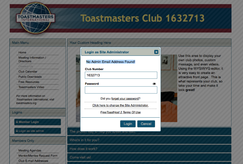 Unable to login as an admin to https:\\1632713.toastmastersclubs.org