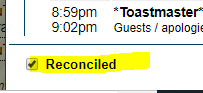 This update after the meeting is important to ensure that meeting reports are accurate so that you can get the full value out of them. By implementing a marking scheme to indicate which agendas have been reconciled, it will be much easier to know how accurate role reports are. Note that you do not have to reconcile your past agendas, but may get a "nag prompt" if you save a past agenda, and your role reports may not be very credible.