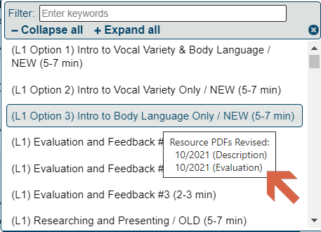 The new Introduction to Vocal Variety and Body language has 3 options for evaluation:1. Evaluation of Vocal Variety and Body Language2. Evaluation of Vocal Variety only3. Evaluation of Body Language onlyOptions 1 and 3 use the same Evaluation resource, but have been listed as separate options to avoid confusion. Option 2 has a different Evaluation Resource. The project description is the same for all three. Only one of the options is required.