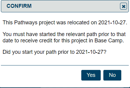 In addition, selecting any of the affected projects causes an enquiry pop-up box to display to confirm that you are eligible to do the project, based on the date your Path was purchased. If, based on your response, you are not eligible, the selection will be cleared.
