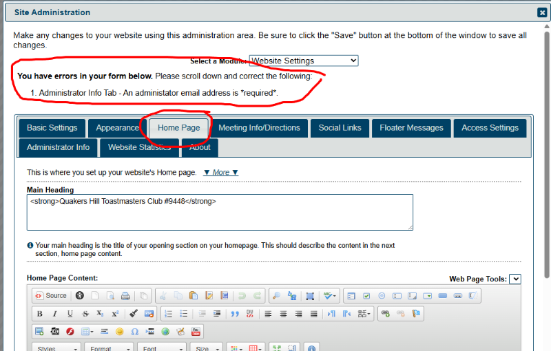 When I am trying to edit the website I am getting error to update the Administrator Info. .
