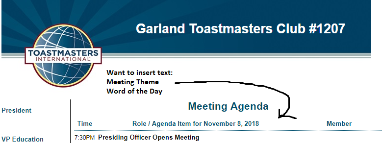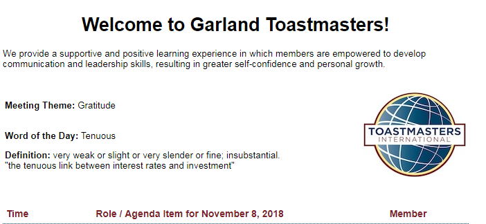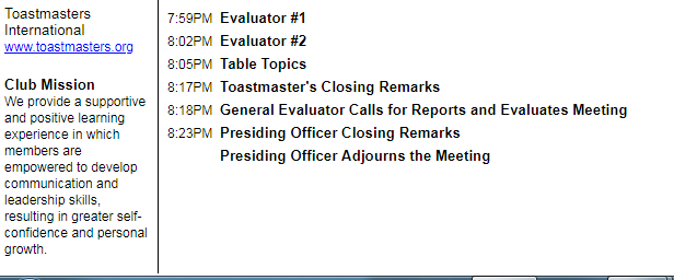 We also like to use space across the entire bottom of the page to put ballot slips for Best Table Topics, Best Speaker, and Best Evaluator.