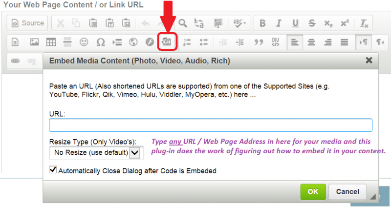 The following annotated screen capture shows how to access the Oembed plug-in. It is the button in the editor with the musical notes on it.