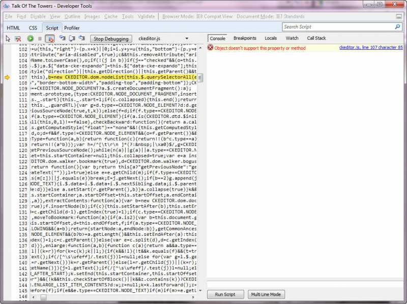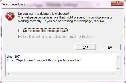 The "Object doesn't support this property or method" issue would be consistent with being in compatibility mode, since that mode shuts off some IE browser functionality.