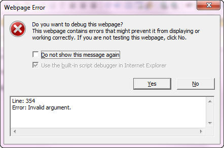 I am a little more concerned about the Invalid Argument error, though. That error should also show up in the list in the Console pane with a link to the right of the error message. Could you click that link so that the relevant javascript shows up at the left and post a screen shot of that?