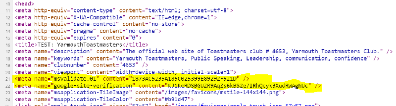 ruffbg wrote: So sorry to keep on at this. I really have no formal knowledge of working with web pages, and am really in over my head. I've managed to get Google to recognize our new URL, but the procedures for BIng don't seem to work. Bing's meta tag option tells me to paste it into the "head" section of our default page, but I don't know how to do that. Pasting it into the designated spot in the Admin. console doesn't result in a verification. I've tried pasting it into the text section of the Home Page, but that didn't work either.