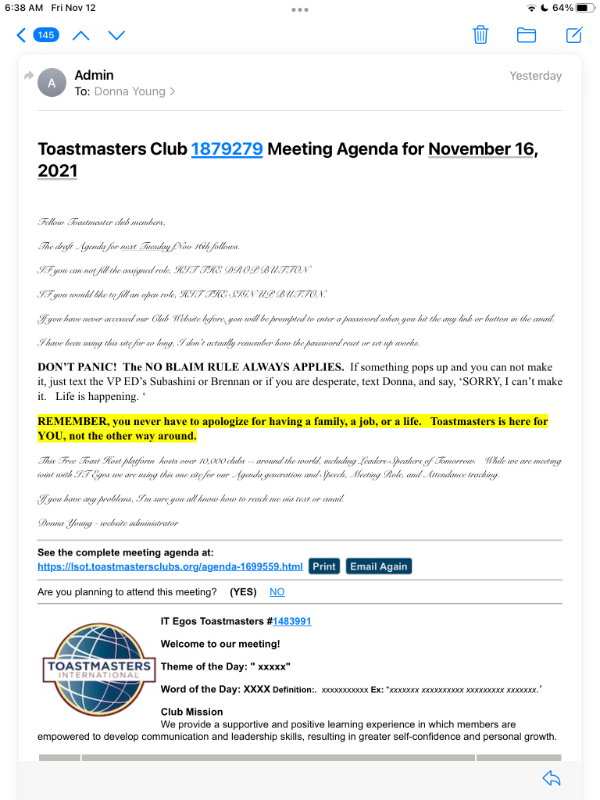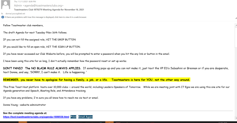 I was sending out the Agenda so members could sign up for roles.