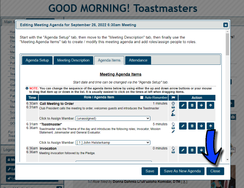 Close button and edit agenda dialog is not working