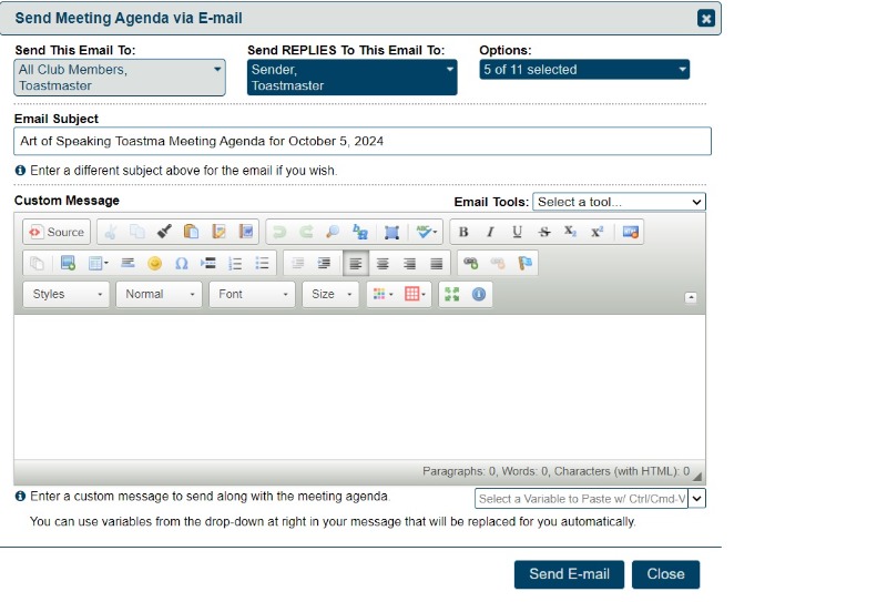 The agenda can only be emailed to members of the club as they have signed the Toastmasters membership form.