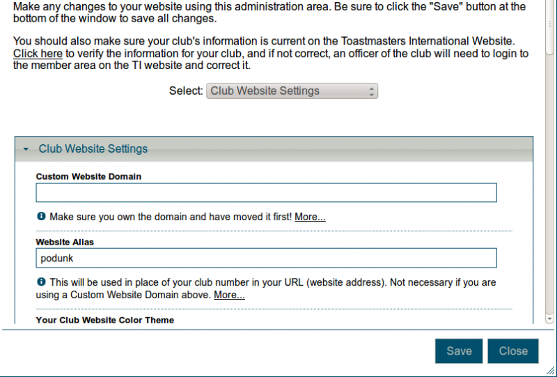 Custom Domain Name is one that doesn't have "toastmastersclubs.org" in it. It will be something along the lines of "podunktalkers.org" It has to be purchased from a domain name registrar and renewed every year. If you're not sure whether your club has one or not, talk to your treasurer, who will know if a payment has been made.