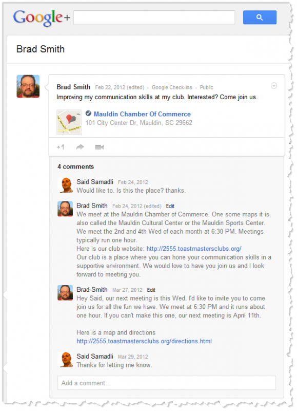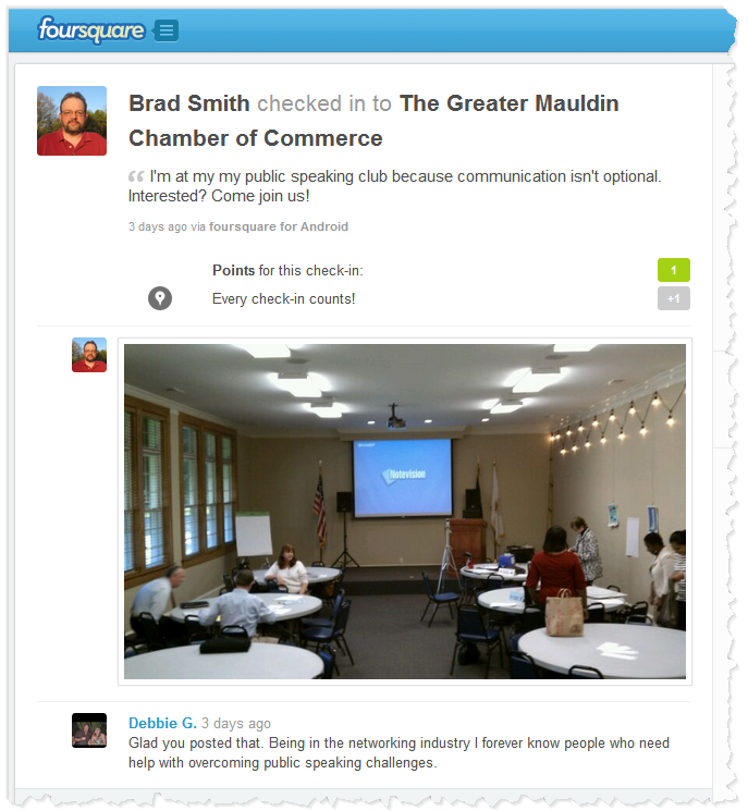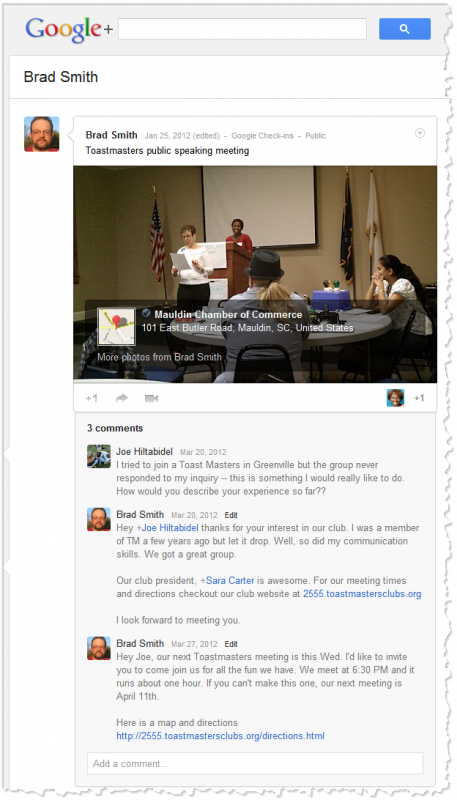 I've been experimenting with social media marketing to help drive interest in Toastmasters. I've had the most luck with Google Plus and FourSquare.